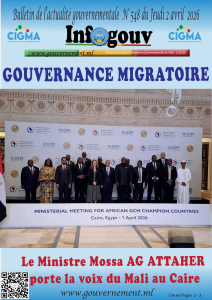 Le Ministre des Maliens établis à l’Extérieur et de l’Intégration africaine, M. Mossa AG ATTAHER, a pris part, ce mercredi 1er avril 2026, au Caire, en Égypte, à la rencontre ministérielle des pays africains champions pour la mise en œuvre du Pacte mondial pour des