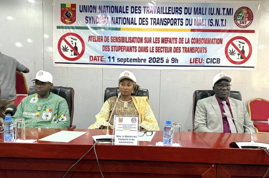 Dans le cadre de la lutte contre les drogues et les stupéfiants, une vaste campagne d’information et de sensibilisation est lancé à l’attention des acteurs du secteur des transports de notre pays. Les travaux de la rencontre de sensibilisation des acteurs du secteur des Transports s’est ouverte ce jeudi 11 Septembre 2025 sous la présence du Ministre des Transports et des Infrastructures, Mme DEMBELE Madina SISSOKO en compagnie de son collègue du Travail et de la Fonction publique, Dr. Fassoun COULIBALY et du Secrétaire général de l’Union nationale des Travailleurs du Mali, Yacouba KATILE. Cette rencontre est organisée par le Syndicat national des Transports du Mali et vise à sensibiliser les travailleurs du secteur des Transports sur l’impact négatif de la consommation des stupéfiants dans le milieu des transports. La cérémonie d’ouverture a été marquée par plusieurs allocutions. Les intervenants ont tous salué la tenue de telles activités qui concourent à informer et sensibiliser ce fléau qui touchent certains milieux professionnels. Madame le Ministre DEMBÉLÉ Madina SISSOKO, qui a prononcé le discours d’ouverture des travaux, a déclaré que près de 40% des candidats sont affectés par la drogue et les substances psychoactives selon le rapport 2024 de recrutement des jeunes dans les forces armées et de sécurité du Mali. Le phénomène prend de l’ampleur et des actions de sensibilisation sont plus que jamais nécessaires, a-t-elle souligné. Selon le Ministre SISSOKO, la conduite de véhicules de toute nature sous l’influence de drogues est strictement interdite. Il est dangereux et illégal de conduire après avoir consommé de la drogue, peu importe la quantité. Elle poursuit que le code de la route punit de peines sévères la conduite en état d’ivresse et sous l’empire de stupéfiants à des peines d’amende et d’emprisonnement qui peuvent aller jusqu’à 2 ans, sans préjudice du retrait du permis de conduire. À travers cette activité, le Syndicat national des Transports du Mali démontre que l’action des syndicats professionnels n’est pas seulement revendication corporatiste mais elle est aussi formation civique de ses membres. Cellule Communication du MTI