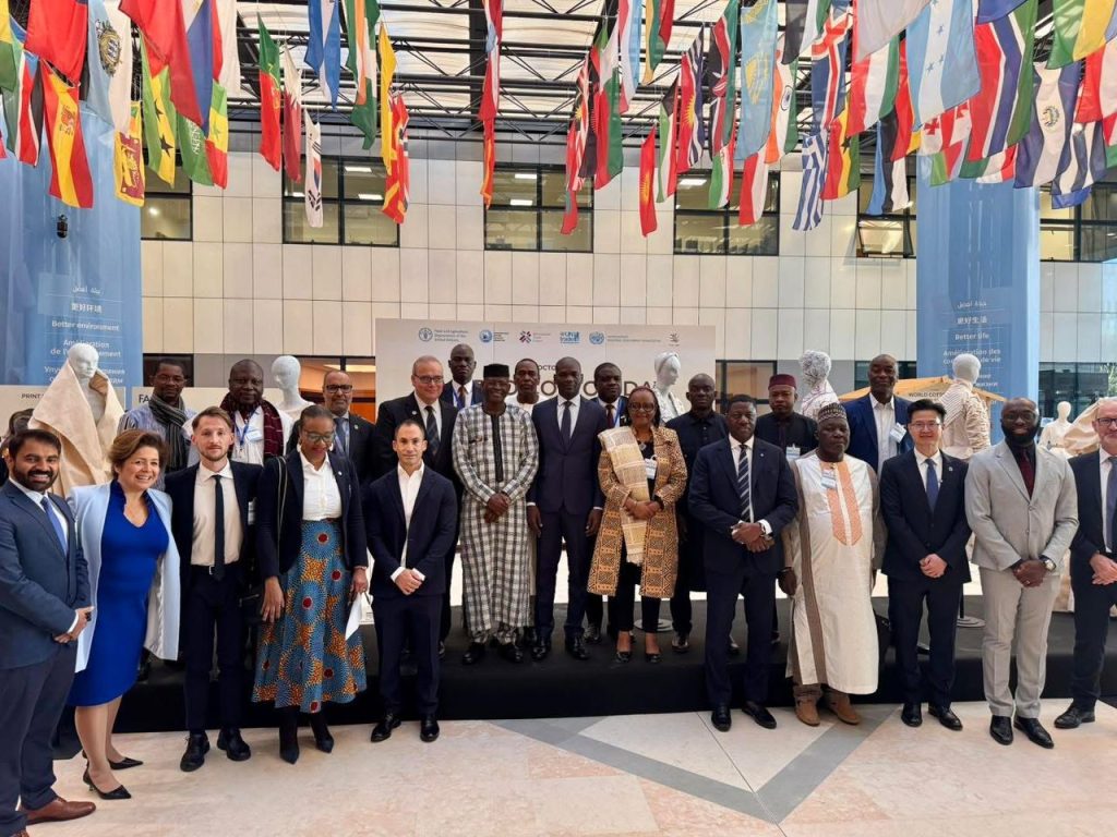 𝗟𝗲 𝗠𝗶𝗻𝗶𝘀𝘁𝗿𝗲 𝗱𝗲 𝗹’𝗜𝗻𝗱𝘂𝘀𝘁𝗿𝗶𝗲 𝗲𝘁 𝗱𝘂 𝗖𝗼𝗺𝗺𝗲𝗿𝗰𝗲 𝗠.𝗠𝗼𝘂𝘀𝘀𝗮 𝗔𝗹𝗮𝘀𝘀𝗮𝗻𝗲 𝗗𝗜𝗔𝗟𝗟𝗢, 𝗖𝗼𝗼𝗿𝗱𝗶𝗻𝗮𝘁𝗲𝘂𝗿 𝗲𝗻 𝗲𝘅𝗲𝗿𝗰𝗶𝗰𝗲 𝗱𝘂 𝗚𝗿𝗼𝘂𝗽𝗲 𝗖𝟰+, 𝗮 𝗽𝗿𝗶𝘀 𝗽𝗮𝗿𝘁, 𝗰𝗲 𝗺𝗮𝗿𝗱𝗶 𝟳 𝗼𝗰𝘁𝗼𝗯𝗿𝗲 𝟮𝟬𝟮𝟱, à 𝗹𝗮 𝗰é𝗹é𝗯𝗿𝗮𝘁𝗶𝗼𝗻 𝗱𝗲 𝗹𝗮 𝗝𝗼𝘂𝗿𝗻é𝗲 𝗺𝗼𝗻𝗱𝗶𝗮𝗹𝗲 𝗱𝘂 𝗰𝗼𝘁𝗼𝗻, 𝗼𝗿𝗴𝗮𝗻𝗶𝘀é𝗲 𝗮𝘂 𝘀𝗶è𝗴𝗲 𝗱𝗲 𝗹𝗮 𝗙𝗔𝗢 à 𝗥𝗼𝗺𝗲, 𝗲𝗻 𝗜𝘁𝗮𝗹𝗶𝗲. 𝗖𝗲𝘁𝘁𝗲 𝗿𝗲𝗻𝗰𝗼𝗻𝘁𝗿𝗲 𝗶𝗻𝘁𝗲𝗿𝗻𝗮𝘁𝗶𝗼𝗻𝗮𝗹𝗲 𝗱𝗲 𝗵𝗮𝘂𝘁 𝗻𝗶𝘃𝗲𝗮𝘂 𝗮 𝗿é𝘂𝗻𝗶 𝗱é𝗰𝗶𝗱𝗲𝘂𝗿𝘀, 𝗽𝗮𝗿𝘁𝗲𝗻𝗮𝗶𝗿𝗲𝘀 𝘁𝗲𝗰𝗵𝗻𝗶𝗾𝘂𝗲𝘀, 𝗼𝗿𝗴𝗮𝗻𝗶𝘀𝗮𝘁𝗶𝗼𝗻𝘀 𝗶𝗻𝘁𝗲𝗿𝗻𝗮𝘁𝗶𝗼𝗻𝗮𝗹𝗲𝘀 𝗲𝘁 𝗮𝗰𝘁𝗲𝘂𝗿𝘀 𝗱𝗲 𝗹𝗮 𝗳𝗶𝗹𝗶è𝗿𝗲 𝗮𝘂𝘁𝗼𝘂𝗿 𝗱’𝘂𝗻 𝗼𝗯𝗷𝗲𝗰𝘁𝗶𝗳 𝗰𝗼𝗺𝗺𝘂𝗻 : 𝗯â𝘁𝗶𝗿 𝘂𝗻 𝗮𝘃𝗲𝗻𝗶𝗿 𝗽𝗹𝘂𝘀 é𝗾𝘂𝗶𝘁𝗮𝗯𝗹𝗲 𝗲𝘁 𝗱𝘂𝗿𝗮𝗯𝗹𝗲 𝗽𝗼𝘂𝗿 𝗹𝗲 𝗰𝗼𝘁𝗼𝗻. La journée a démarré par une visite guidée de l’exposition consacrée à la diversité de la filière cotonnière mondiale, retraçant le parcours de la fibre, du champ à la mode, en compagnie de son homologue, Ministre en charge du commerce du Tchad, suivi de la cérémonie inaugurale. Dans son allocution, le Ministre a salué l’engagement de la FAO et des organisations partenaires dans la promotion du coton africain, tout en rappelant la place stratégique de cette culture dans les économies des pays producteurs. Pour le Mali, le coton représente près de 11,3 % des recettes d’exportation, 3,7 % du PIB, et fait vivre directement près de 4 millions de personnes. Le Ministre a également lancé un appel appuyé aux membres de l’Organisation mondiale du commerce (OMC), afin que les engagements pris à Hong Kong, Bali et Nairobi soient enfin traduits en actes concrets, notamment sur la question cruciale des soutiens internes qui faussent la compétitivité du coton africain. Au-delà des plaidoyers politiques, la journée a permis de mettre en lumière la créativité et le savoir-faire africains à travers des segments dédiés à la valorisation locale, au design et à l’innovation. Des jeunes créateurs et entrepreneurs sous la direction du créateur de mode Alphadi, ont présenté des modèles inspirants de transformation du coton, porteurs de valeur ajoutée et d’emplois durables pour le continent. MIC