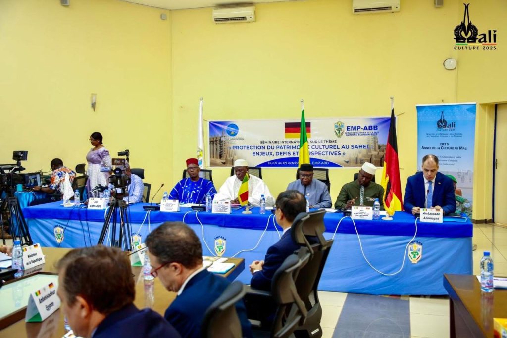 Ce mardi 7 octobre 2025, s’est tenue à l’École de maintien de la paix Alioune Blondin Beye de Bamako, la cérémonie d’ouverture officielle du Séminaire International autour du thème : « 𝑷𝒓𝒐𝒕𝒆𝒄𝒕𝒊𝒐𝒏 𝒅𝒖 𝒑𝒂𝒕𝒓𝒊𝒎𝒐𝒊𝒏𝒆 𝒄𝒖𝒍𝒕𝒖𝒓𝒆𝒍 𝒂𝒖 𝑺𝒂𝒉𝒆𝒍 : 𝑬𝒏𝒋𝒆𝒖𝒙, 𝒅é𝒇𝒊𝒔 𝒆𝒕 𝒑𝒆𝒓𝒔𝒑𝒆𝒄𝒕𝒊𝒗𝒆𝒔 ». Après la cérémonie d’ouverture, la leçon inaugurale du séminaire a été donnée par le Ministre Mamou DAFFE, parrain de l’évènement, autour du thème principal de séminaire. Ce séminaire selon le Ministre Mamou DAFFE cadre parfaitement avec la vision des plus hautes autorités du Mali pour la valorisation du patrimoine culturel surtout en cette Année de la Culture au Mali décrétée par Son Excellence le Général d’Armée Assimi GOÏTA, Président de la Transition, Chef de l’État, qui a rappelé que le renouveau de notre Nation passe d’abord par la réappropriation de nos valeurs et de notre héritage. La cérémonie d’ouverture était présidée par le Ministre délégué auprès du Premier ministre, chargé des Réformes politique et institutionnelles avec à ses cotes le Ministre de l’Artisanat, de la Culture, de l’Industrie Hôtelière et du Tourisme M. Mamou DAFFE, Le Ministre d’ Ministre de l’Enseignement supérieur et de la Recherche scientifique Pr. Bouréma KANSAYE, le Ministre de la Jeunesse et des Sports, chargé de l’Instruction civique et de la Construction citoyenne M. Abdoul Karim FOMBA en présence des représentants du corps diplomatique au Mali et de plusieurs experts du domaine du patrimoine culturel. Organisé par l’École de Maintien de la Paix en collaboration avec l’Ambassade d’Allemagne au Mali, ce séminaire prévu du 7 au 9 octobre 2025 vise à comprendre les enjeux actuels, favoriser le partage d’expériences et renforcer les capacités des acteurs impliqués dans la gestion du patrimoine culturel en vue d’assurer une protection effective et durable des biens culturels dans les pays en proie avec les conflits au Sahel. 𝐌𝐀𝐂𝐈𝐇𝐓