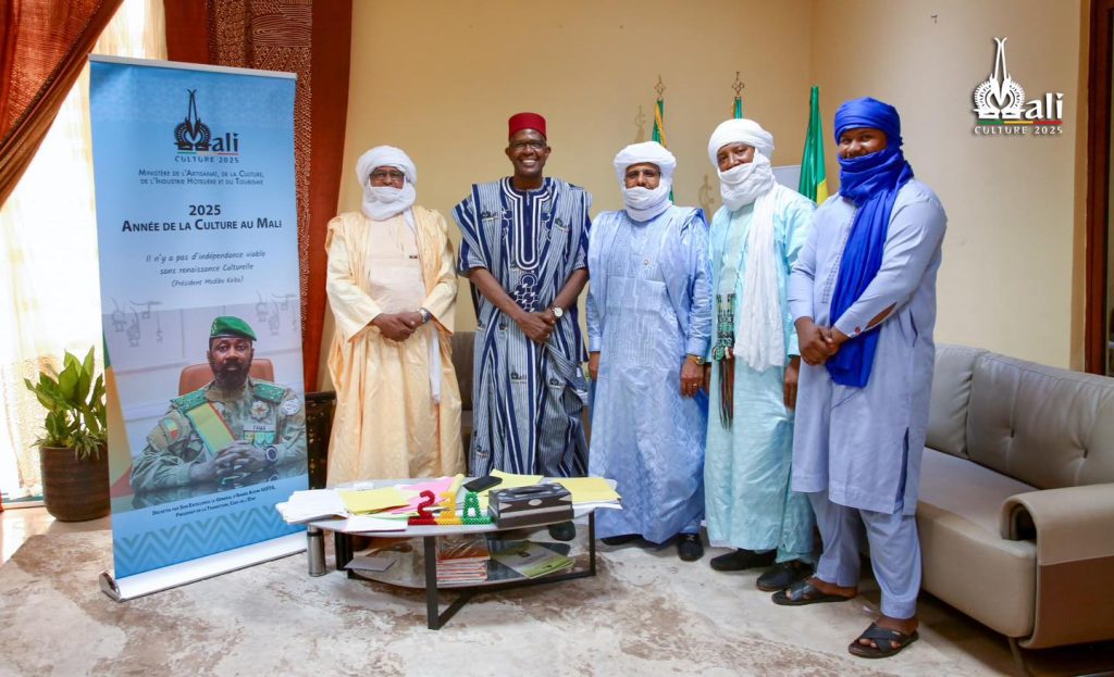 C’est avec beaucoup d’enthousiasme que le Ministre de la Culture, M. Mamou DAFFÉ a reçu, ce vendredi 14 novembre 2025, la délégation du Collectif des Imouchaghes et Alliés (CIAT), conduite par son président M. Ibrahim Ag NOCK. Cette rencontre s’inscrit dans le cadre des préparatifs de la Biennale artistique et culturelle de Tombouctou, prévue du 18 au 28 décembre 2025. En effet, le Collectif des Imouchaghes et Alliés (CIAT), à travers les 22 communes de la région, ont mobilisé plus de 50 bœufs et 10 tonnes de riz pour accueillir les délégations venues des 19 régions du Mali, ainsi que du District de Bamako. Ce geste illustre un profond attachement aux valeurs de solidarité, d’hospitalité et de patriotisme, piliers de cette grande fête, qui se veut un espace de communion et de cohésion entre les communautés. Le Ministre Mamou DAFFÉ a salué cette initiative exemplaire, qu’il considère comme une preuve de la résilience et de l’engagement patriotique des populations. Il a exprimé sa gratitude, envers le président Ibrahim Ag NOCK et encouragé le Collectif pour son rôle fédérateur, au service de l’unité et de la culture malienne. Pour rappel, le Collectif intégrateur des Imouchagh et alliés (CIAT) s’est engagé pour la réussite de ce rendez-vous culturel depuis le début des préparatifs. Ces contributions constantes dans l’organisation traduit cet engagement et cet élan de solidarité afin soutenir l’esprit du rayonnement culturel dans la région de Tombouctou éprouvée par la crise sécuritaire. Le Collectif des Imouchagh et Alliés à travers cette forte donation alimentaire marque sa détermination à soutenir cet espace d’expression culturelle dédiée à la restauration des valeurs qui unissent les Maliens de tous les bords et consolident les efforts des autorités de la transition malienne vers la paix et la cohésion sociale. « Donnons-nous la main pour la cohésion sociale et l’unité dans la diversité », a déclaré le président du Collectif intégrateur des Imouchagh et alliés, Ibrahim Ag Nock. Le CIAT est présent par 212 chefs de villages et fractions, 116 élus et les 12 maires tous membres du collectif. Il est investi auprès du Gouverneur de Région de Tombouctou pour la promotion et la recherche de toutes les initiatives de développement, de la paix, la cohésion sociale et l’unité dans la diversité. MACIHT