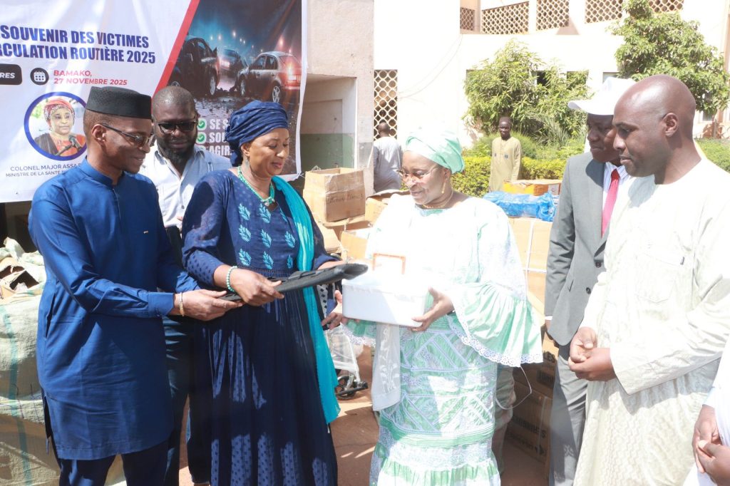 Dans le cadre des activités de la Journée mondiale du souvenir des victimes des accidents de la circulation routière, les Ministres des Transports et des Infrastructures et de la Santé et du Développement social ont effectué ce jeudi matin une visite à l’Hôpital Gabriel TOURÉ. Les deux membres du Gouvernement était accompagnés des membres de leurs cabinets et des chefs de services des deux départements. L’objectif de cette visite est de témoigner le soutien du Gouvernement aux victimes d’accidents de la route et souhaiter prompt rétablissement. La première étape de cette visite, hautement symbolique, a concerné une visite au service des urgences et le bloc de la traumatologie de l’hôpital Gabriel TOURÉ. Les deux ministres ont pu constater les conditions de prise en charge des accidentés de la voie publique. La seconde partie a été consacrée à la remise symbolique d’un important kit de soins sanitaires par Madame le Ministre DEMBÉLÉ Madina SISSOKO à sa collègue Colonel Major Assa Badiallo TOURE. Ces kits sont destinés aux centres hospitaliers et universitaires (CHU) Gabriel TOURE et de Kati. Ce don est constitué de matériels pour la mobilité des malades entre les différents blocs de prise en charge : fauteuils roulants, brancards pliables, chariots 2 étages, civières pour ambulance etc., de matériels médicaux : gants, ballons de réanimation, masques d’oxygène, sondes, urinoirs et des boites de premiers soins pour les pansements, les sutures et autres traitements d’urgence. Pour le Ministre des Transports et des Infrastructures, ce geste est une marque de solidarité et de compassion à l’endroit des hôpitaux bénéficiaires et vise à améliorer les soins offerts aux accidentés de la route. À titre de rappel, la Journée du souvenir des victimes des accidents de la circulation routière est commémorée le 3ème dimanche du mois de novembre de chaque année dans tous les pays membres des Nations unies. À cet effet, le ministère des Transports et des Infrastructures, à travers l’Agence nationale de la Sécurité routière (ANASER) organise des activités de sensibilisation des usagers de la route et des remises de kits de soins sanitaires aux hôpitaux. MTI