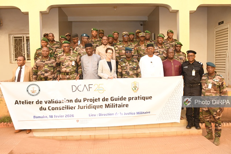 Dans le cadre du renforcement de l’Etat de droit au sein des Forces Armées et de Sécurité, une session de formation consacrée à la validation du guide du conseiller juridique s’est tenue, le mercredi 18 février 2026, au sein de la Direction de la Justice militaire. Cette initiative vise à renforcer les compétences des auditeurs de justice militaire ainsi que celles des autres acteurs judiciaires concernés, afin d’améliorer l’efficacité et la rigueur de l’action judiciaire. Le Directeur de la Justice Militaire, le Colonel-major Boubacar MAÏGA, a exprimé sa gratitude aux autorités pour leur engagement dans le renforcement de la gouvernance et a également remercié la DCAF pour son soutien à la modernisation de la justice. Il a présenté l’atelier comme une référence, insistant sur l’importance capitale de la validation d’un instrument juridique dont les observations reflètent les besoins opérationnels. Pour sa part, Valérie Petit PIERRE, cheffe de bureau de la DCAF Mali, a déclaré que la collaboration entre la DCAF et la Justice Militaire constitue une véritable source de fierté. Elle a permis la tenue de nombreuses formations et activités, témoignant du courage et de l’engagement dans le domaine de la sécurité. Le guide qui sera valider, servira de référentiel et contribuera à renforcer l’efficacité du conseiller juridique dans l’accomplissement de ses missions. DIRPA