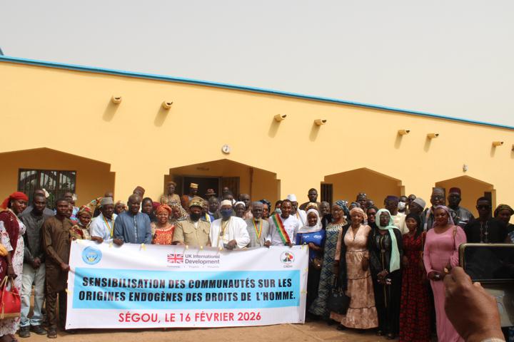 Dans le cadre de son mandat de promotion des droits de l’Homme, la Commission Nationale des Droits de l’Homme (CNDH) a organisé à Ségou, le 16 février 2026, une session de sensibilisation des communautés sur les origines endogènes des droits de l’Homme. Cette activité rentre dans le cadre de la mise en œuvre du projet de sensibilisation des communautés sur les origines endogènes des droits de l’Homme, financé par l’Ambassade du Royaume-Uni au Mali. Elle s’inscrit dans une dynamique de valorisation des fondements culturels et historiques des droits humains au Mali. La cérémonie d’ouverture était présidée par Mohamed Aboubacrine Ag Mohad Ali, Conseiller aux Affaires Administratives et Juridiques du Gouverneur de Région de Ségou. Elle s’est déroulée en présence de Bouaré Bintou Founè SAMAKE, Commissaire à la CNDH et présidente de la sous-commission protection des droits de l’Homme, du Rapporteur Général, Dr Omorou Zakaria TOURE, ainsi que des autorités communales, des chefs traditionnels, des leaders religieux et des représentants des organisations de la société civile. Le représentant du Gouverneur, dans son discours, a insisté sur le fait que la promotion des droits humains est un « combat collectif ». « Les droits de l’Homme ne doivent pas être perçus comme une notion imposée. Ils existent dans nos traditions, nos coutumes positives et nos mécanismes communautaires », a-t-il affirmé, au nom de l’exécutif régional. La présidente de la sous-commission protection des droits de l’Homme, Bouaré Bintou Founè SAMAKE a profité de cette occasion pour rappeler les missions essentielles de la CNDH avant de souligner que cette campagne vise à utiliser nos propres référentiels, qui sont les récits et les normes sociales pour faciliter l’appropriation des droits humains par les populations. Des acteurs communautaires, notamment, des leaders religieux et traditionnels, des chasseurs, des jeunes, des femmes, des personnes vivant avec un handicap, des hommes de média ont pris part à cette activité. À travers cette sensibilisation, la CNDH entend mettre en lumière, les valeurs traditionnelles maliennes, qui consacrent la dignité humaine, la solidarité, la justice et le respect de l’autre. Pour la CNDH, la protection des droits de l’Homme est une responsabilité partagée. Nul n’est à l’abri de la violation de ses droits. CNDH Mali