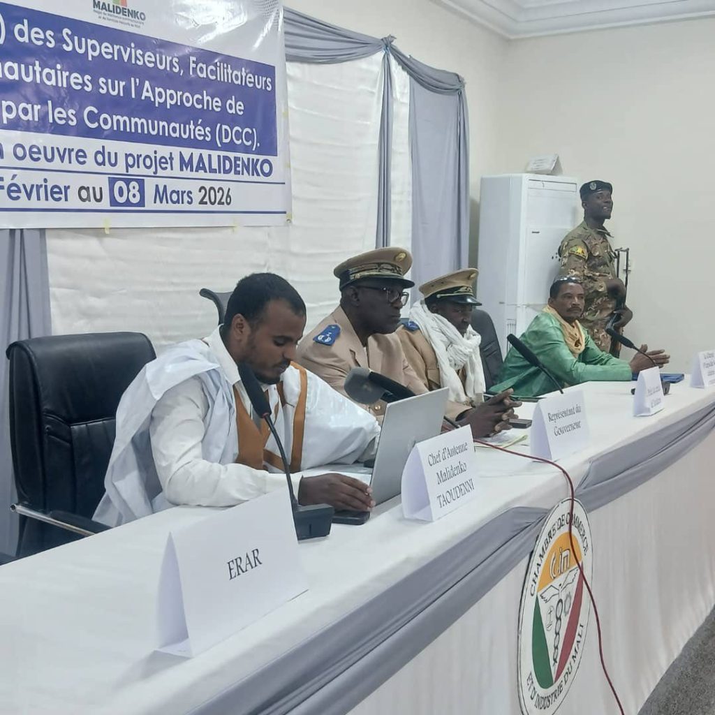 Ce mercredi 25 février 2026, ont débuté les travaux de la formation sur l’approche du Développement conduit par les Communautés (DCC) au profit des facilitateurs communautaires (FC), facilitateurs techniques (FT) et superviseurs communautaires (SC) du projet MALIDENKO dans la région de Taoudenni. Cette troisième vague de formation, qui s’inscrit dans le cadre du renforcement des capacités des acteurs de mise en œuvre, se déroulera sur une période de douze (12) jours, comprenant deux (2) jours de simulation pratique et dix (10) jours de formation théorique. La cérémonie d’ouverture était présidée par le Directeur de cabinet, représentant le gouverneur de la région de Taoudenni. Ont également pris part à cette cérémonie ; le Préfet, le chef de l’équipe régionale d’appui à la réconciliation (ERAR) et le représentant du conseil régional de Taoudenni. Dans son discours d’ouverture, le directeur de cabinet a tenu à remercier chaleureusement le ministre d’État, ministre de la Réconciliation, de la Paix et de la Cohésion nationale, le Général de corps d’armée Ismaël WAGUÉ, d’avoir offert une opportunité d’emploi à 66 jeunes de la région de Taoudenni dans le cadre du projet MALIDENKO. Il a instruit les nouveaux agents à suivre assidûment cette formation afin de pouvoir transmettre les connaissances acquises sur cette approche innovante, où les communautés sont placées au cœur des actions de développement qui les concernent. « Le développement par les communautés pour les communautés, un chemin pour la paix. » MRPCN