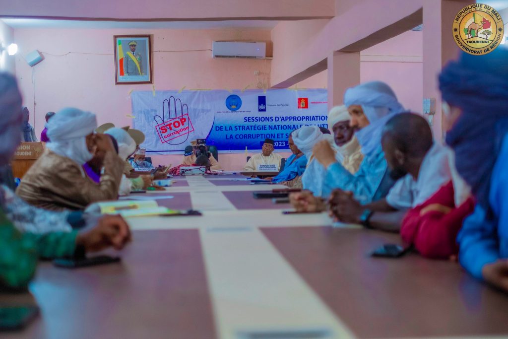La salle de réunion du Gouvernorat de Taoudenni a abrité, ce mardi 31 mars 2026, une session d’appropriation de la stratégie nationale de lutte contre la corruption et son plan d’action 2023-2027 Cette session, qui a pour but d’outiller l’administration et les administrés, visait, aussi à promouvoir la bonne gouvernance, à lutter contre le blanchiment d’argent, l’enrichissement illicite et le terrorisme. Elle est mise en place par le secrétariat permanent de la Stratégie nationale de lutte contre la corruption (SNLCC), sous l’égide du Ministère de la Refondation de l’État. Elle a réuni une cinquantaine de participants issus des cercles et communes de la Région. Pour Brehima Kalilou DIAWARA, expert auprès du secrétariat permanent de la Stratégie nationale de lutte contre la corruption, Il s’agit d’un mécanisme de prévention et de lutte contre la corruption, qui favoriserait l’implication active des acteurs, dans la mise en œuvre de la politique publique de lutte contre la corruption. Il a fallu près de trois heures d’horloge aux représentants de l’État, les élus à la base, les forces de défense et de sécurité ainsi que certaines organisations de la société civile pour échanger autour des enjeux liés à la transparence, la bonne gouvernance et la redevabilité dans la gestion des affaires publiques. L’épine dorsale des discussions, qui a concerné le plan d’action de la stratégie nationale, lancé en décembre 2023, a été présentée en guise de repère pour l’amélioration de la qualité des services offerts aux citoyens. Afin de garantir des résultats concrets, les unes et les autres ont convenu que seule une appropriation collective pourrait garantir des résultats concrets à la réussite de la mission. Il faut rappeler que la session était présidée au nom du Gouverneur de région, par le Directeur du cabinet, en la personne de Bollé MAOULOUD BABY, qui saluera l’initiative et réaffirmera l’engagement des autorités régionales à accompagner la mise en œuvre effective de ladite stratégie. Baby conclura en exhortant les participants à s’impliquer, pleinement, afin de devenir des relais actifs entre le ministère de la Refondation de l’Etat, le Secrétariat permanent et leurs structures respectives. Gouvernorat Taoudenni