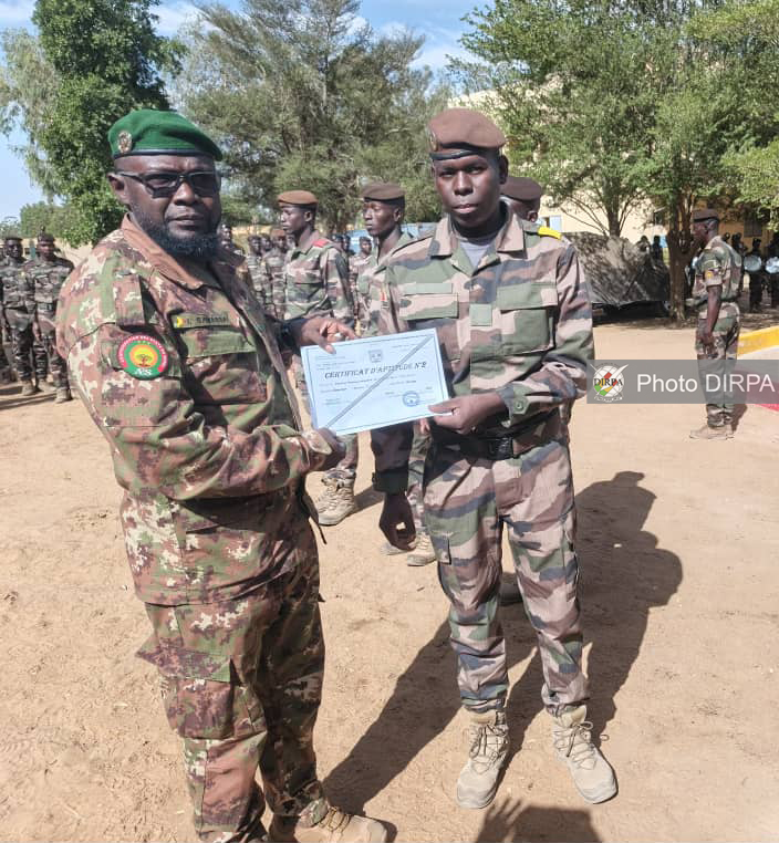 La cérémonie de fin de formation classique des CAT 1 et CAT 2 (service général et ouvrier) s’est tenue, ce jeudi 16 avril 2026, au Centre d’Instruction de la Garde Nationale, au Camp de Garde de Gao, en présence du Commandant de zone, le Colonel Ibrahim SAMASSA, du Commandant de la Région Garde N°7, le Colonel Sounkalo COULIBALY, ainsi que de plusieurs responsables militaires de la région. Ils sont au total 64 stagiaires, dont 35 au titre du Certificat d’Aptitude Technique N°1 et 29 du Certificat d’Aptitude Technique N°2, à avoir suivi, durant six mois, la formation classique professionnelle. Ces stagiaires, appelés à devenir des chefs d’équipe et des chefs de groupe au sein de la Garde Nationale et de l’Armée de l’Air, avaient pour mission de renforcer leurs connaissances militaires, notamment en Armement, en Techniques de Combat, en Topographie, en ISTC, en Préparation Opérationnelle ainsi que dans autres compétences techniques. Le Directeur du Centre d’Instruction, le Lieutenant Ibrahim DIALLO a exhorté les stagiaires à faire un bon usage des connaissances acquises au cours des six mois de formation dans leurs futures missions. Les trois premiers de chaque spécialité ont reçu leur Certificat d’Aptitude Technique des mains des responsables des Forces de Défense et de Sécurité. La cérémonie s’est achevée par des démonstrations de close combat ainsi que des simulations de protection et de défense de hautes personnalités. DIRPA