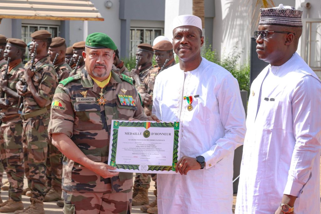 Le Premier ministre, Chef du Gouvernement, le Général de Division Abdoulaye Maïga, a été décoré de la Médaille d’honneur de la Police nationale et de la Protection civile, ce vendredi 17 Avril 2026. En effet, le Président du Conseil National de la Transition, le Général de Corps d’Armée Malick DIAW est également récipiendaire de cette distinction honorifique de la Police Nationale, ainsi que les Ministres d’État (Ministre de la Réconciliation, de la Paix et de la Cohésion nationale et Ministre de l’Économie et des Finances. Au total, la Médaille d’honneur de la Police nationale et de la Protection civile récompense cette année, 55 récipiendaires ont été honorés. Pour le ministre de la Sécurité et de la Protection civile, le Général de Division Daoud ALY MOHAMMEDINE, hôte du jour, ces décorations sont le reflet de l’engagement et de la volonté de réussir les missions assignées. Dans son allocution, il a souligné que cette distinction est une invite à exceller par l’ardeur à la tâche. Le porte-parole des récipiendaires, le Premier ministre Abdoulaye Maïga, a exprimé au nom de ses pairs sa fierté et sa joie. « C’est une marque de confiance », a-t-il déclaré, avant de prendre l’engagement de servir d’exemple et d’encourager les autres à maintenir un haut niveau d’exigence. Il a particulièrement remercié le ministre de la Sécurité dont l’action s’inscrit sous l’impulsion du Président de la Transition, Chef de l’État, le Général d’Armée Assimi GOÏTA. PRIMATURE