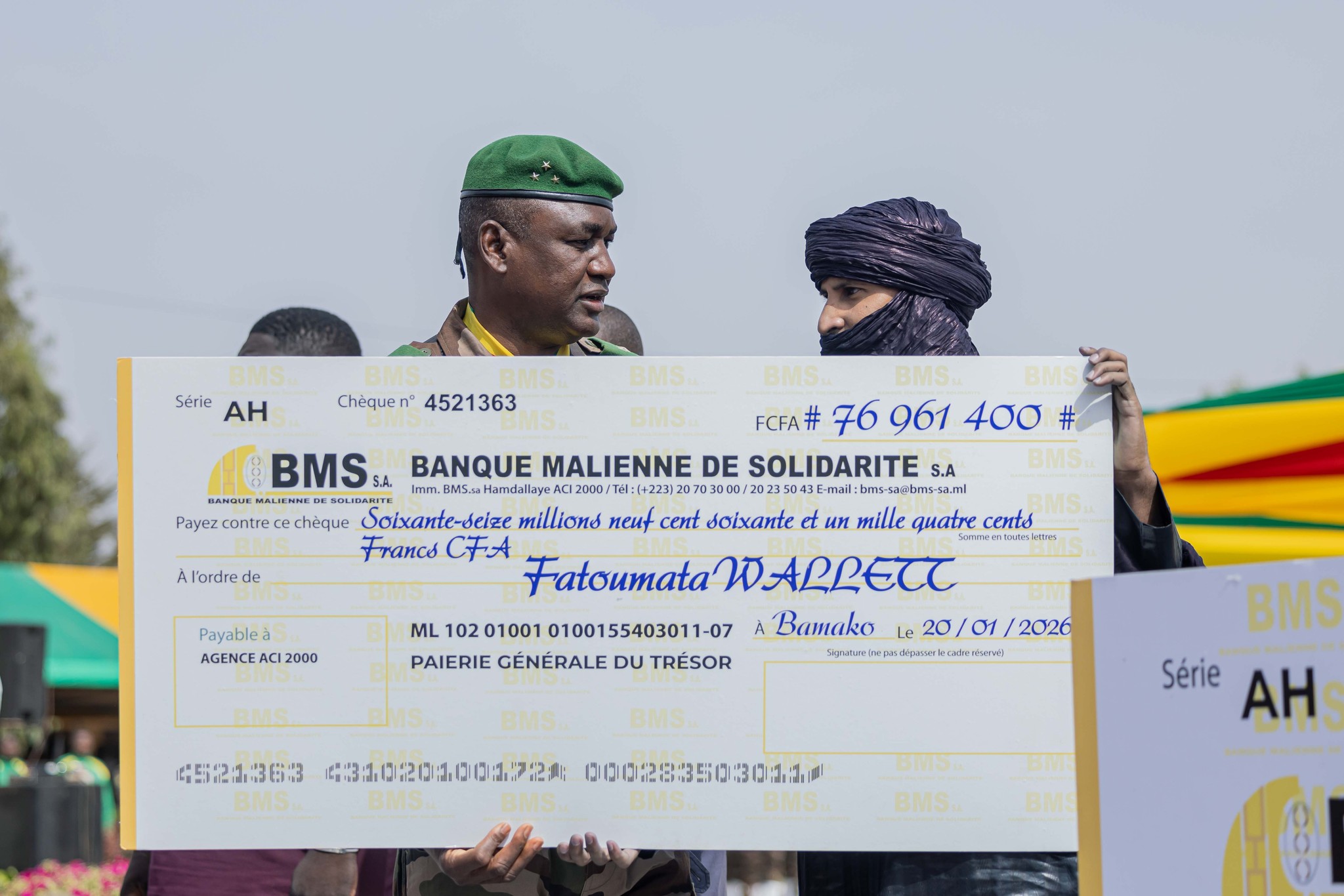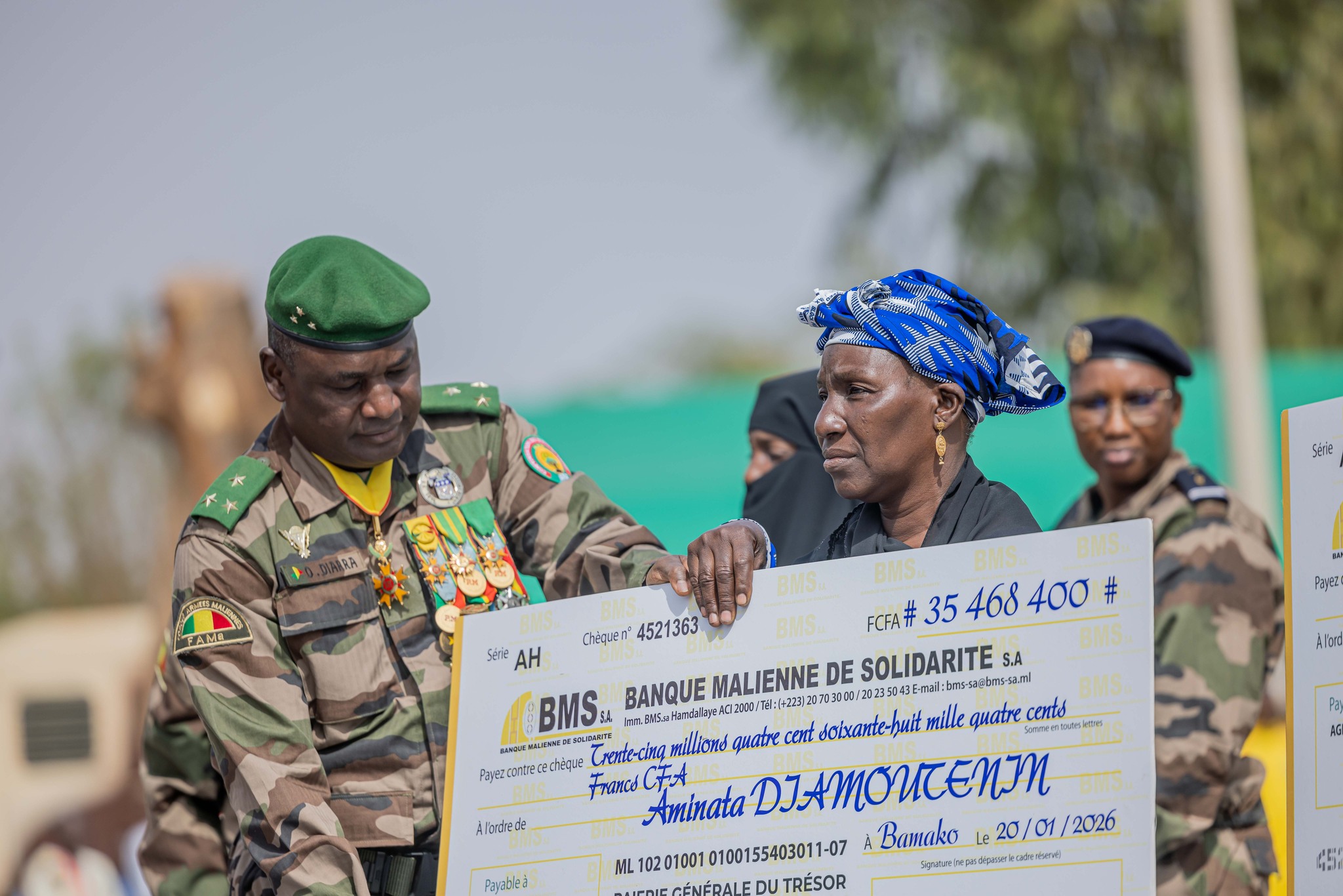 Le Président de la Transition a également remis un chèque géant d’un montant de 17 213 725 920 F CFA au Ministre de la Défense et des Anciens combattants, qui l’a transmis au Directeur du service social des Armées. Des chèques individuels ont ensuite été distribués aux ayant droit lors de la cérémonie.