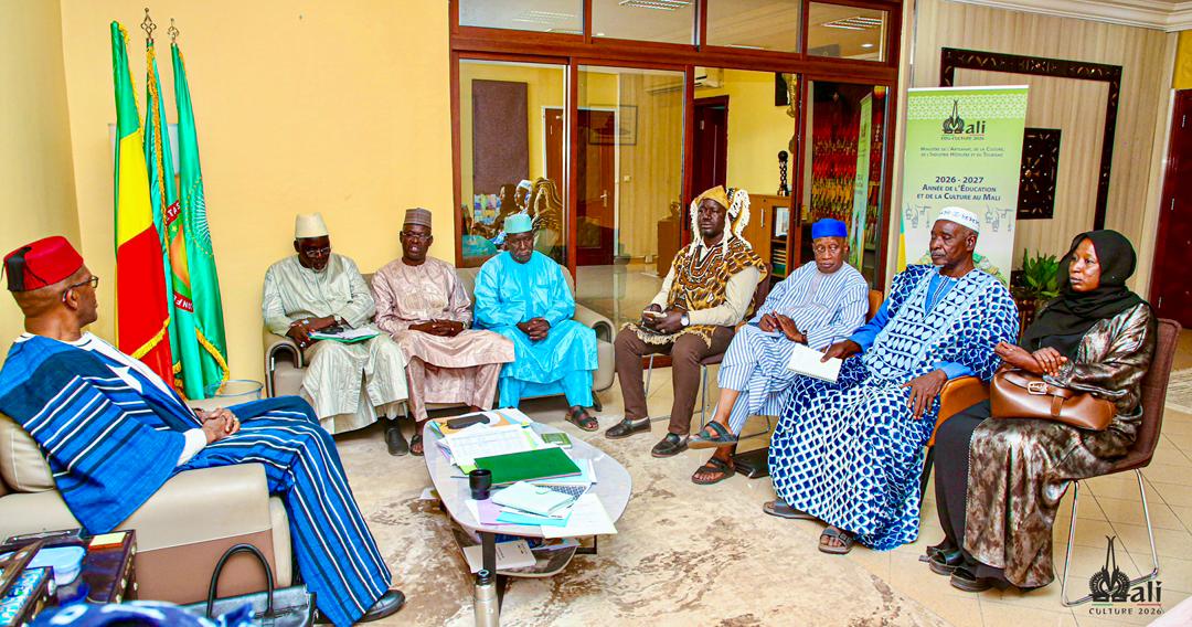 Une délégation de l’Association Culturelle des Soninkés du Mali (ACS-Mali), conduite par son président Dr Abderrahmane SYLLA, ancien ministre, a été reçue en audience, le lundi 23 février 2026 par le Ministre de l’Artisanat, de la Culture, de l’Industrie hôtelière et du Tourisme, Mamou DAFFÉ.