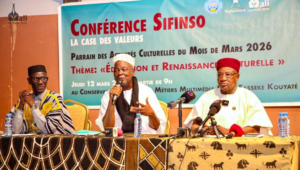 Le Conservatoire des Arts et Métiers Multimédia Balla Fasseké KOUYATE (CAMM-BFK) de Bamako a accueilli, ce jeudi 12 mars 2026, la première conférence de l’espace FASO SIFINSO (La case des valeurs) de 2026 animée par l’artiste comédien et membre du CNT, Magma Gabriel KONATÉ, parrain des activités culturelles du mois de mars 2026, s’inscrivant dans la période 2026-2027 décrétée Année de l’Éducation et de la Culture par Son Excellence le Général d’Armée Assimi GOÏTA, Président de la Transition, Chef de l’État. L’événement était présidé par le Chef de Cabinet du ministère de l’Artisanat, de la Culture, de l’Industrie hôtelière et du Tourisme, Dr. Salia MALÉ, représentant le Ministre Mamou DAFFÉ. Cette conférence a enregistré la participation des membres du Cabinet du Ministère de l’Artisanat, de la Culture, de l’Industrie hôtelière et du Tourisme, des membres du Conseil National de Transition (CNT), des enseignants et étudiants du Conservatoire Balla Fasseké Kouyaté, des artistes et acteurs culturels. Placée sous le thème « Éducation et renaissance culturelle », la conférence a mis en lumière les fondements de l’éducation aux valeurs sociétales du Mali et la responsabilité collective dans la formation des enfants. « Faso Sifinso » se présente comme un espace socio-éducatif et de débat sur les valeurs de la société malienne. Il vise à contribuer à la refondation des mentalités et à la formation du nouveau type de Malien, en conciliant héritage traditionnel et apports modernes. Le parrain KONATÉ a rappelé que l’éducation traditionnelle reposait sur des cycles de sept ans, allant de la naissance jusqu’à l’âge de quarante-neuf ans, considéré comme l’achèvement de la formation sociale et éducative. Selon lui, ce modèle, fondé sur le savoir-être et le savoir-faire, doit inspirer la construction d’un système éducatif adapté aux réalités contemporaines et contribuer à une véritable renaissance culturelle et éducative au Mali. MACIHT