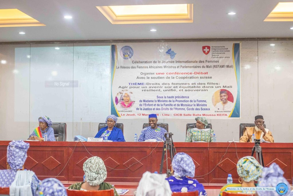 Le Ministre de la Justice et des Droits de l’Homme, Garde des Sceaux Mamoudou KASSOGUE a coprésidé, ce jeudi 12 mars 2026, l’ouverture d’une Conférence-Débat au Centre International des Conférences de Bamako (CICB). Organisée par le Réseau des Femmes Anciennes Ministres et Parlementaires du Mali (REFAMP/Mali), cette conférence porte sur le thème : Droits des femmes et des filles : Agir pour un avenir sûr et équitable dans un Mali résilient, unifié et souverain. Un thème que le Garde des Sceaux qualifie d’actualité et révélateur du rôle crucial que les femmes doivent jouer dans le contexte actuel de notre pays. Dans son allocution, le Garde des Sceaux a rendu un hommage appuyé aux femmes fondatrices de cette association, qui, depuis sa création en 1996, continue de jouer, pleinement son rôle en faveur des femmes. Avant de déclarer ouverte la cérémonie, le Ministre a assuré de sa disponibilité pleine et entière, ainsi que celle de son Département, à accompagner les femmes dans leur combat noble et digne pour la protection et la promotion des Droits des femmes au Mali.