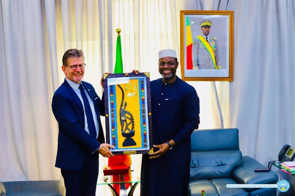 Le Ministre de la Justice et des Droits de l’Homme, Garde des Sceaux, a accordé ce jour une audience solennelle au Chef de mission d’EUCAP Sahel Mali, Monsieur Peter Kolding, venu présenter ses adieux officiels au terme d’un mandat marqué par un engagement constant. Cette rencontre a permis au Garde des Sceaux de dresser un bilan élogieux de la coopération fructueuse entre son département et la mission européenne. Le Ministre a tenu à saluer avec insistance l’appui stratégique et multidimensionnel apporté par EUCAP Sahel, tant dans la modernisation des infrastructures que dans le renforcement rigoureux des capacités des acteurs judiciaires. Il a souligné que cette synergie a été un levier essentiel pour la consolidation de l’État de droit et l’ancrage d’une justice plus résiliente au Mali. En guise de haute reconnaissance pour son dévouement et la qualité des services rendus à la Nation, le Ministre a honoré son hôte en lui remettant un Ciwara d’art. Au-delà de l’objet, ce trophée iconique, symbole malien de bravoure, d’ardeur au travail et d’excellence consacre le succès d’une mission accomplie avec une intégrité exemplaire. Ce geste d’adieu, empreint de fraternité et de respect mutuel, scelle durablement l’héritage d’une collaboration exemplaire au service de la paix et de la justice. MJDH
