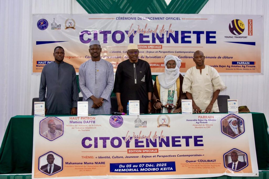 Le Mémorial Modibo Keïta a accueilli, ce vendredi 5 décembre 2025, la cérémonie d’ouverture du projet « Week-end de la Citoyenneté, Édition Spéciale ». L’événement s’est déroulé en présence des chargés de mission du Ministère de l’Artisanat, de la Culture, de l’Industrie hôtelière et du Tourisme, Adama KOITÉ et Amadou DIABATÉ, représentant le Ministre Mamou DAFFÉ. Cette initiative, soutenue par le Ministère de l’Artisanat, de la Culture, de l’Industrie hôtelière et du Tourisme, s’inscrit dans le cadre de l’Année de la Culture décrétée par Son Excellence le Général d’Armée Assimi GOÏTA, Président de la Transition, Chef de l’État. Organisée par l’Association Action Jeunesse Sociale – Mali (A.J.S-MALI), l’édition spéciale du « Week-end de la Citoyenneté », prévue du 5 au 7 décembre 2025, mobilise la jeunesse autour des valeurs de culture, civisme, cohésion sociale et patriotisme. Formations, sensibilisations, excursions culturelles, visites patrimoniales et soirées artistiques composent un programme riche, renforçant la collaboration entre le Ministère et les organisations de jeunesse. MACIHT