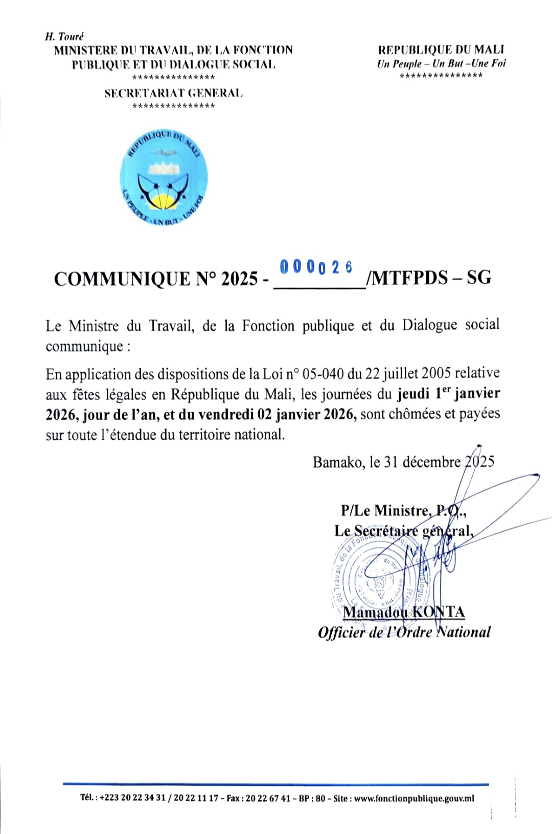 En application des dispositions de la Loi n°05-040 du 22 juillet 2005 relative aux fêtes légales en République du Mali, les journées du jeudi 1er janvier 2026, jour de l’an, et du vendredi 02 janvier 2026, sont chômées et payées sur toute l’étendue du territoire national.