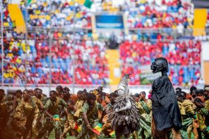 A son arrivée au stade, juste après les honneurs militaires, le Président de la République de Guinée a échangé une poignée de main avec son homologue malien avant de s’installer dans la loge présidentielle, pour le début des travaux.
