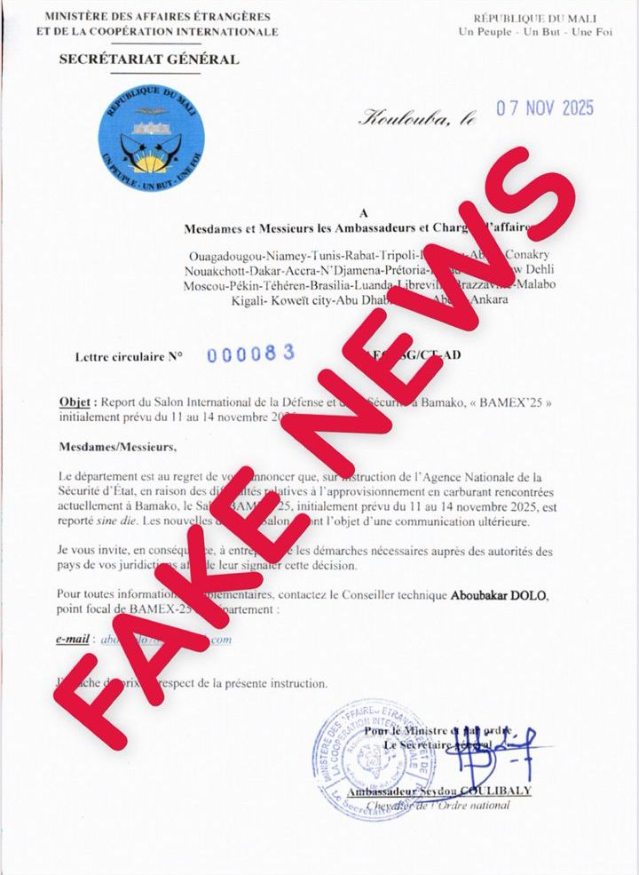 Le Ministère des Affaires étrangères et de la Coopération internationale attire l’attention de l’opinion publique que des individus mal intentionnés ont mis en circulation une fausse correspondance sur les réseaux sociaux indiquant le report du Salon international de la Défense et de la Sécurité à Bamako « BAMEX 25 ».