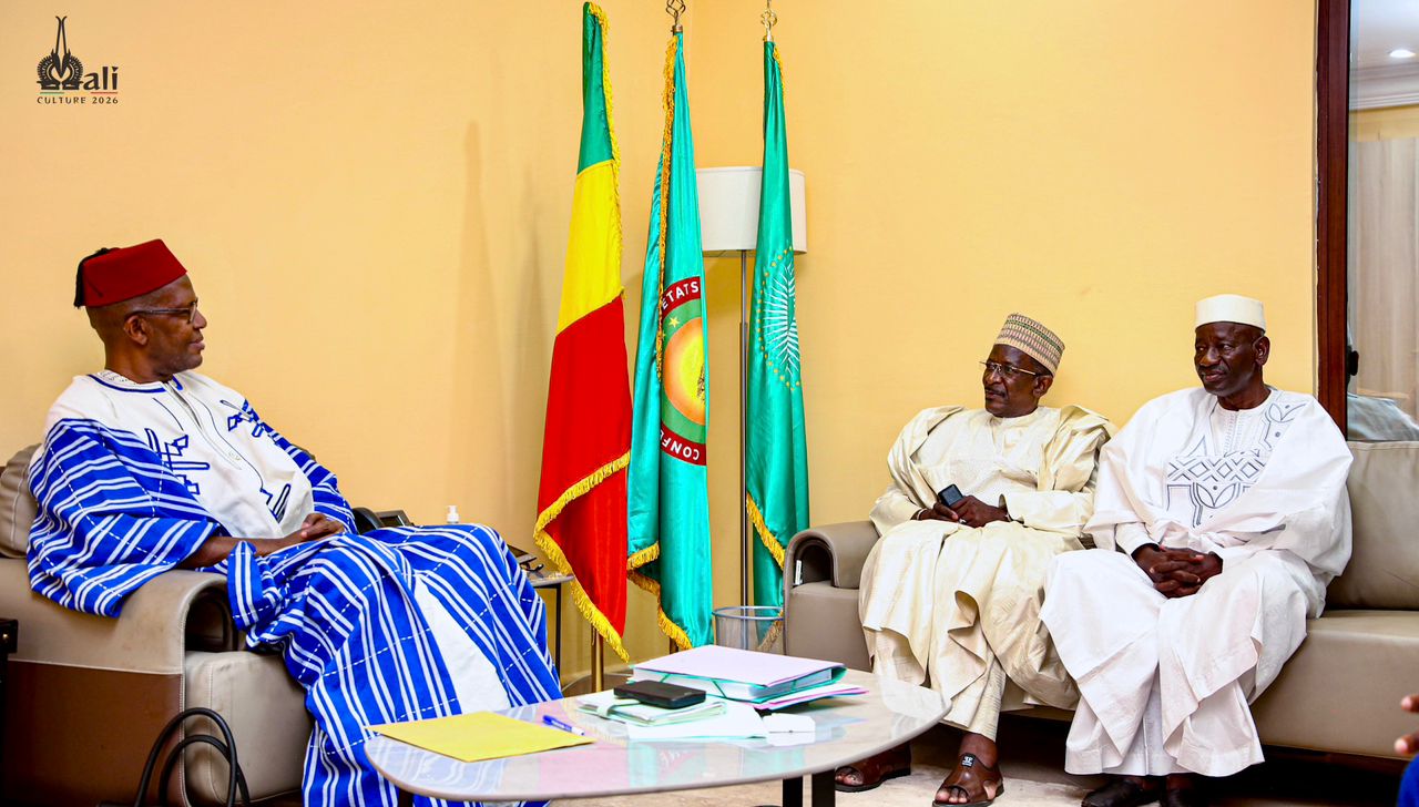 Une délégation de légitimités traditionnelles de Koutiala conduite par le nouveau patriarche (Jamana Tigui) de Koutiala, Adama Sidiki OUATTARA, accompagné du président de l’association des ressortissants de Koutiala à Bamako, Yoro COULIBALY, a été reçue, le mardi 14 avril 2026, par le ministre de l’Artisanat, de la Culture, de l’Industrie hôtelière et du Tourisme, Mamou DAFFÉ.