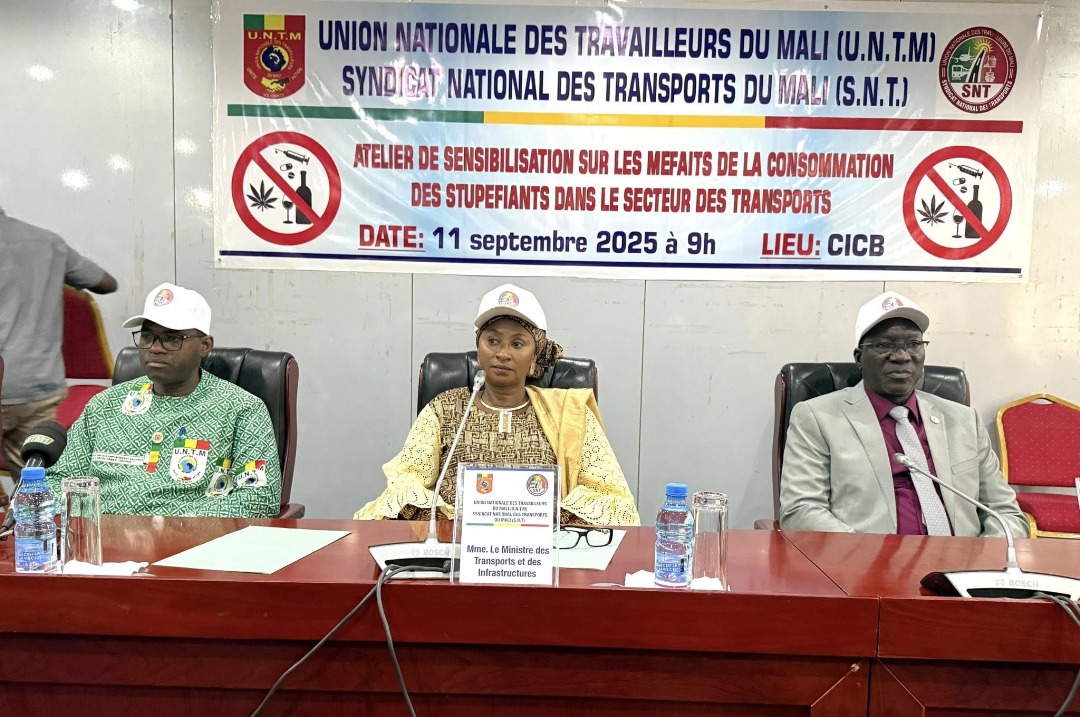 Dans le cadre de la lutte contre les drogues et les stupéfiants, une vaste campagne d’information et de sensibilisation est lancé à l’attention des acteurs du secteur des transports de notre pays. Les travaux de la rencontre de sensibilisation des acteurs du secteur des Transports s’est ouverte ce jeudi 11 Septembre 2025 sous la présence du Ministre des Transports et des Infrastructures, Mme DEMBELE Madina SISSOKO en compagnie de son collègue du Travail et de la Fonction publique, Dr. Fassoun COULIBALY et du Secrétaire général de l’Union nationale des Travailleurs du Mali, Yacouba KATILE.