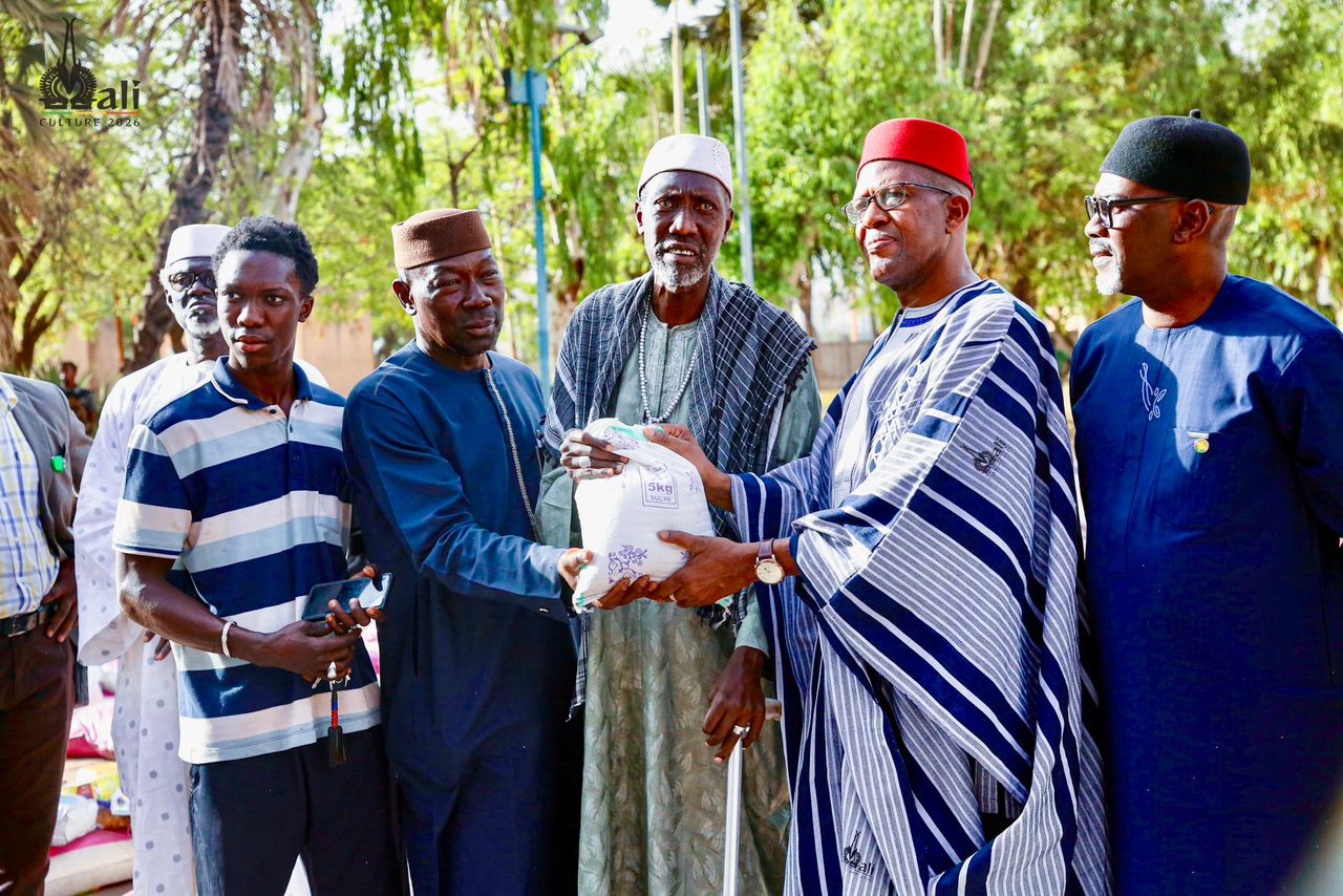 Le Ministre de l’Artisanat, de la Culture, de l’Industrie hôtelière et du Tourisme, Mamou DAFFÉ, a présidé, le mardi 24 février 2026, dans le cadre des œuvres sociales de Son Excellence le Général d’Armée Assimi GOÏTA, Président de la Transition, Chef de l’État, la cérémonie de remise de 1 000 kits alimentaires aux acteurs de l’Artisanat, de la Culture et du Tourisme. L’événement s’est déroulé en présence de Aguibou DEMBÉLÉ, Conseiller spécial du Président de la Transition, chargé des œuvres sociales, ainsi que des autorités administratives, traditionnelles et coutumières, et des chefs de services du Département.