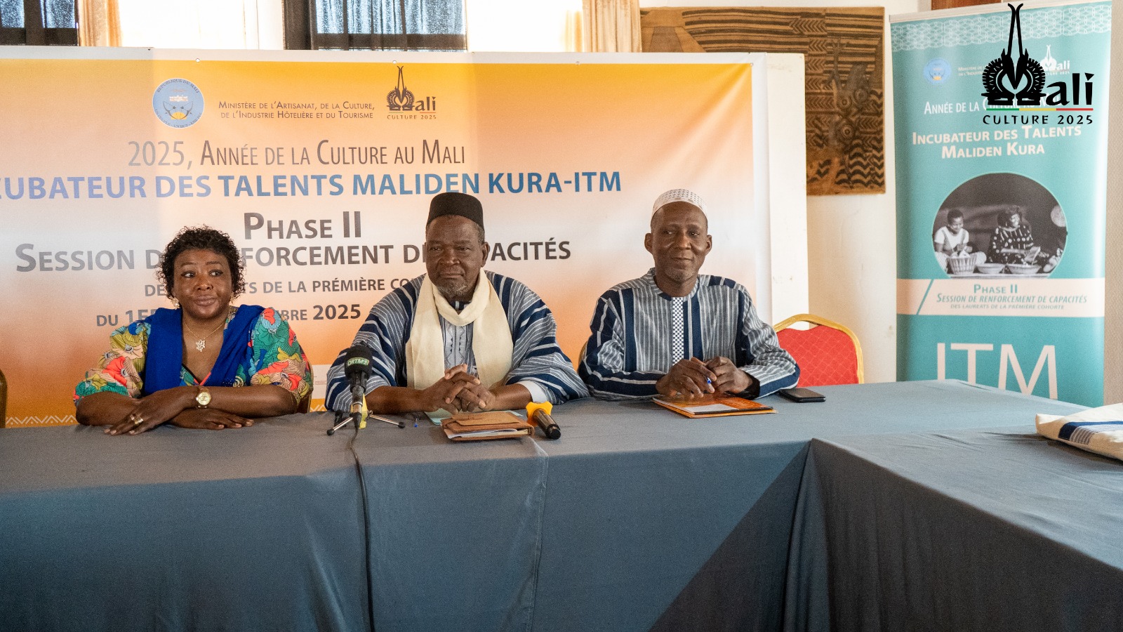 La cérémonie de lancement de la deuxième phase de session de renforcement de capacités des lauréats de la 1ère cohorte du projet d’Incubateur des Talents Maliden Kura – ITM a eu lieu, ce lundi 1er décembre 2025, à l’Hôtel Mandé de Bamako. La Cérémonie a été présidée par Dr Salia MALÉ, Chef de Cabinet du Ministère de l’Artisanat, de la Culture, de l’Industrie hôtelière et du Tourisme, représentant le Ministre Mamou DAFFÉ.