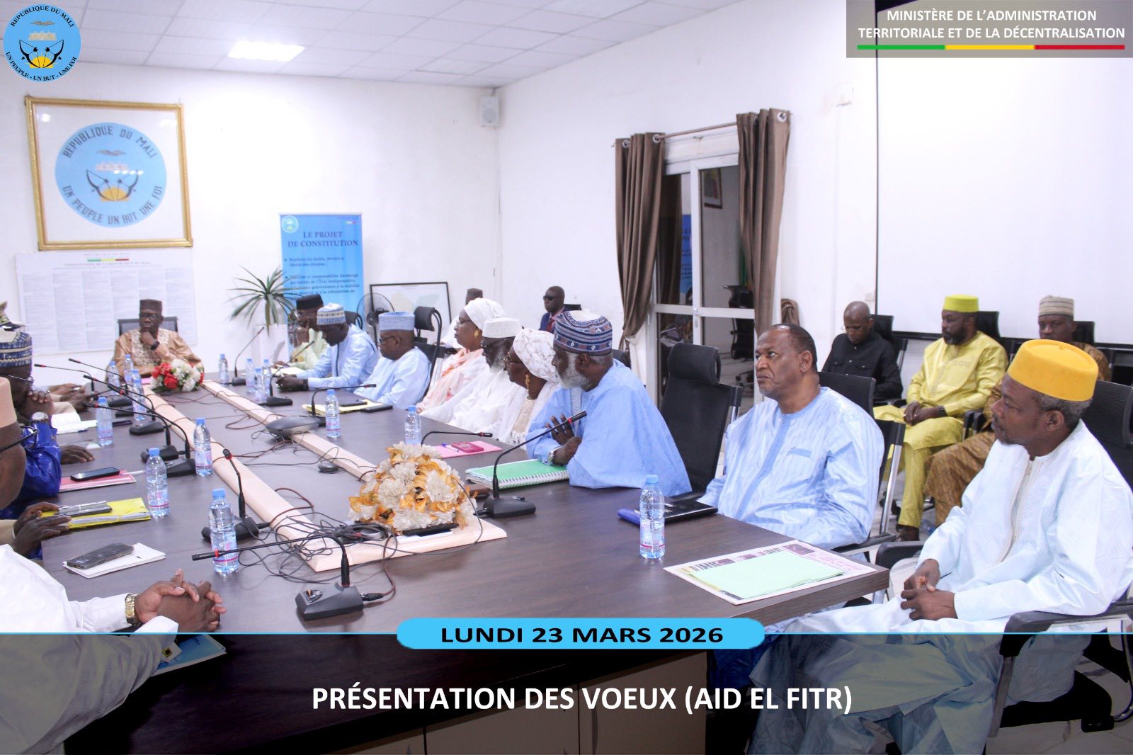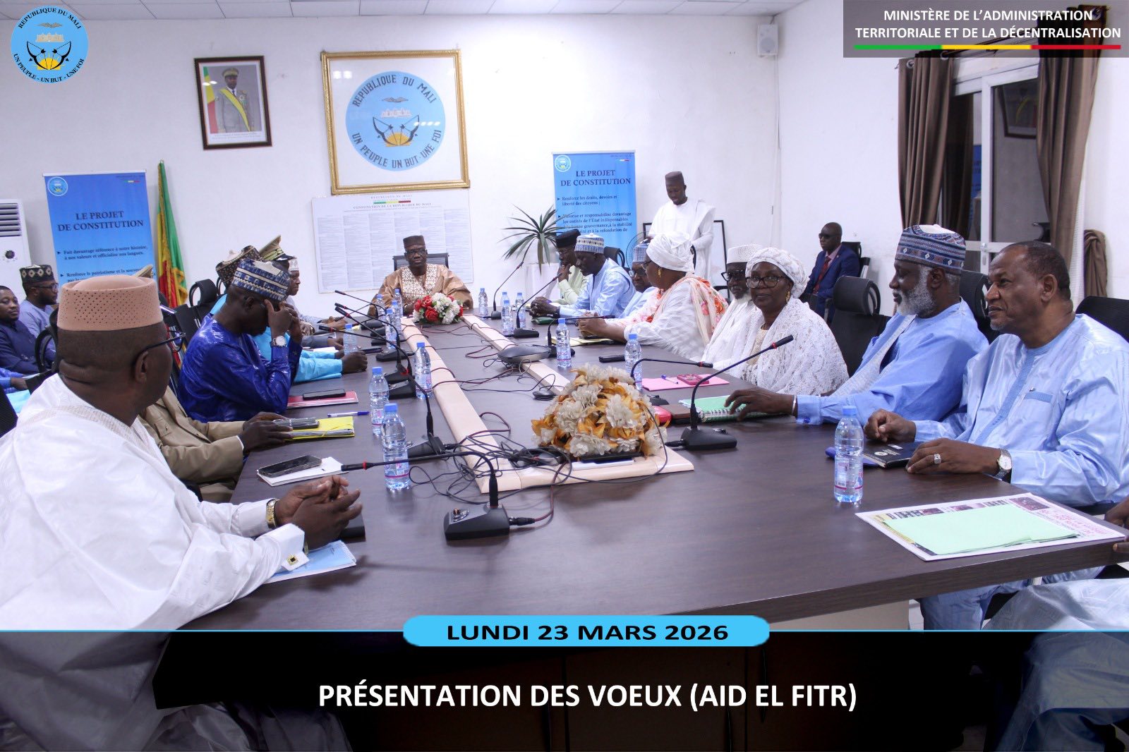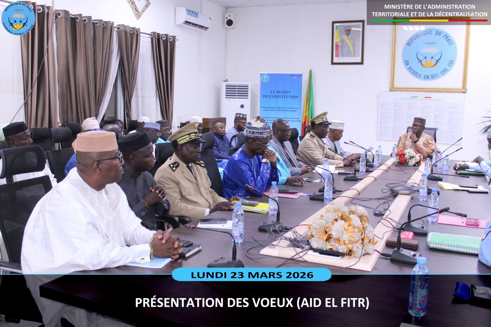Ce lundi 23 mars 2026, le Ministre de l’Administration Territoriale et de la Décentralisation, le Général de Brigade Issa Ousmane COULIBALY a reçu les vœux de bonne fête de Ramadan du personnel du Département réuni dans la salle de conférence du département pour la traditionnelle cérémonie de présentation de vœux, à l’occasion de la fête de l’Aïd el-Fitr (fête de Ramadan).